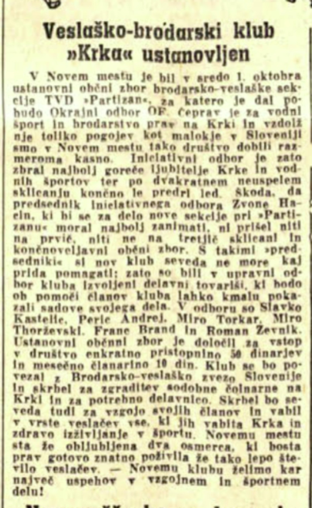 Začetki veslanja na reki Krki segajo v leto 1950. Skupaj s Štajerci in Gorenjci smo lahko tudi Dolenjci hvaležni zavzetosti tedanjih ljubljanskih veslačev. Na temelju pobude VK Ljubljanica ( tedaj VK Savica ) k ustanovitvi Veslaške zveze Slovenije, lahko v njihovem zborniku izdanem ob 100. obletnici na strani 16 najdemo kronološki zapis nastanka novih veslaških klubov: ” 13. julija 1952 je bil ( VK Ljubljanica ) soustanovitelj Veslaške zveze Slovenije, ki je nastala v prostorih našega kluba. Da pa bi lahko imeli Veslaško zvezo Slovenije, je bilo potrebno ustanoviti več klubov. Tako je bil VK Savica pobudnik in je prispeval tudi nekaj veslaške opreme za ustanovitev mariborskega VK Branika v februarju 1950 ter veslaške sekcije ŠD Gozdar na Bledu ( danes VK Bled )maja 1950. Decembra 1950 je pomagal tudi pri ustanovitvi veslaške sekcije v TVD Partizan Novo mesto.” vir: VK Ljubljanica 1908-2008. Nastavki razvoja novomeškega veslanja segajo torej v december 1950 in tudi Dolenjci smo prve čolne prejeli iz Ljubljane, že v letu 1953 pa je VZS organizirala in uspešno izvedla tudi prvo Novomeško regato.